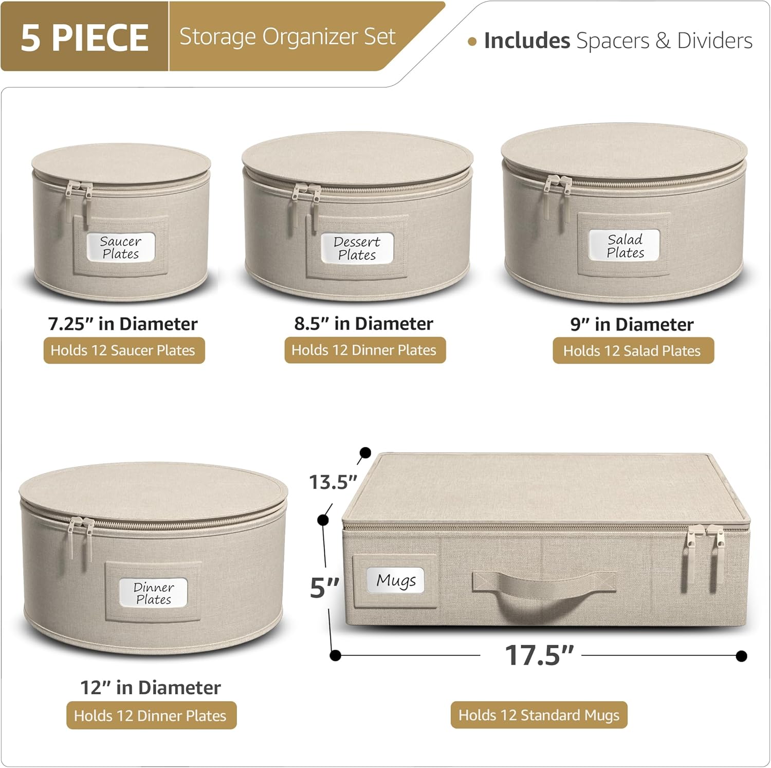 - Sorbus China Dinnerware Storage 5 Piece: Store and organize dinnerware & accessories and fine china with this quilted 4 Piece china storage case set - Approximate Measurements Round Dinner Plate Case 12β D x7.5β H, Salad Plate Case 9β D x6 β H, Dessert Plate Case 8.5β D x 5.5β H, Saucer Plate Case 7.25β D x 5.25β H Cup Storage Case (for up to 12 cups) - Each case includes a content label window to insert your own label to quickly identify contents inside