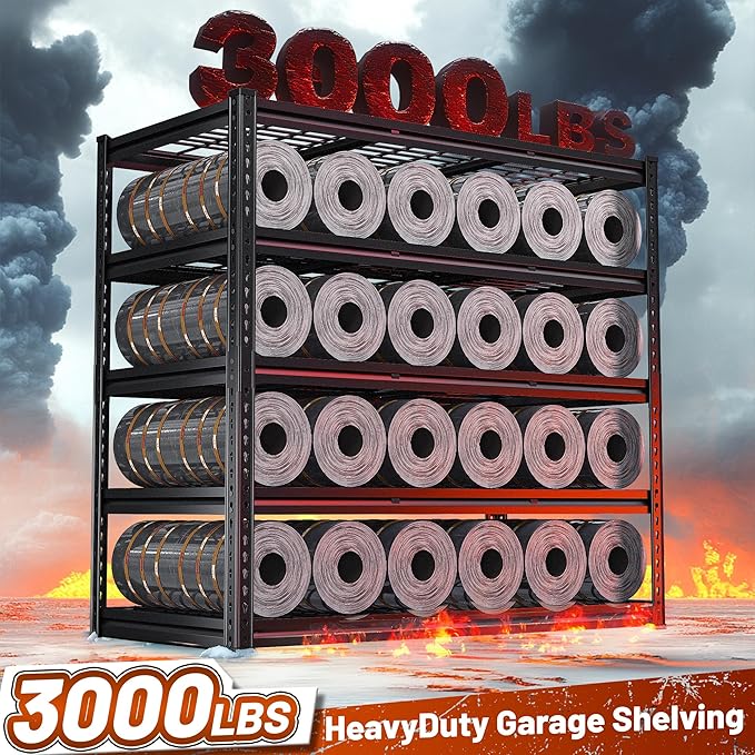 - 【3000LBS Garage Shelving Heavy Duty】The metal shelving adopts thickened double-layer columns, and the heavy duty shelving is made of sound metal material. Each layer of shelves has 4 double layers of steel wire and 2 additional braces, thickened metal columns and beams provide greater support to prevent this garage shelves from deformation and bend. Each sturdy shelf layer can hold up to 600 LBS for a total carrying capacity of 3000 LBS
