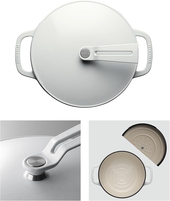 - Instant Evaporation: With Vermicular’s proprietary enamel coating, the pot quickly eliminates surface moisture, making the pot ideal for fast cooking methods like searing, stir-frying, and steam-roasting.