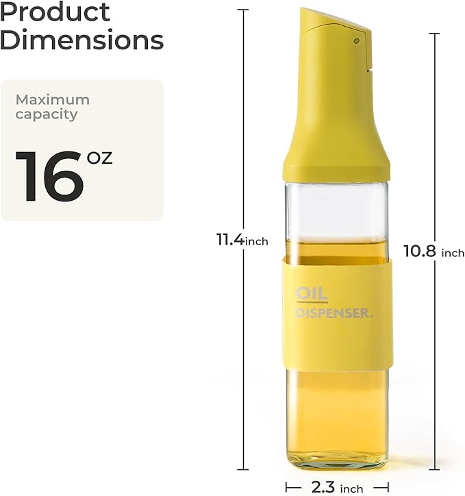 Olive Oil Dispenser for Cooking - 16oz Leakproof Glass Oil Dispenser Bottle with Gravity Spout, Air Fryer, BBQ, Healthy Salad & Non-Stick Pans, BPA-Free, Easy to Refill and Use, Yellow