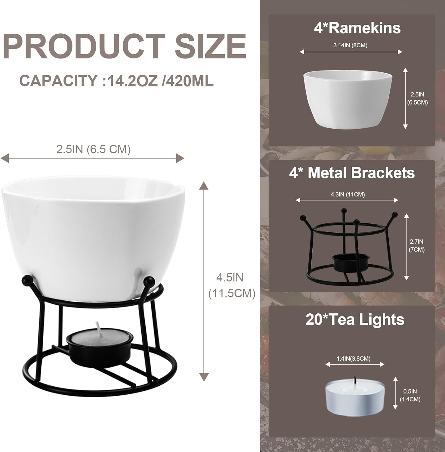 - SETS INCLUDES :4 pack 420ML large Ramekins;4 Metal Brackets;20*Tea Lights;butter warmer can adjustment in the tea-light candle placement to ensure an optimal distance from the flame to the ceramic bowl.The butter warmers are melte the butter. It also serves as an ideal seafood boil party accessory for serving dips, salsas,dressings, and condiments,as well as side dishes ,olives ect. Making them a nice portion for lobster ,crab ect, and Ramekins,candles and metal stands have the ideal dimensions.