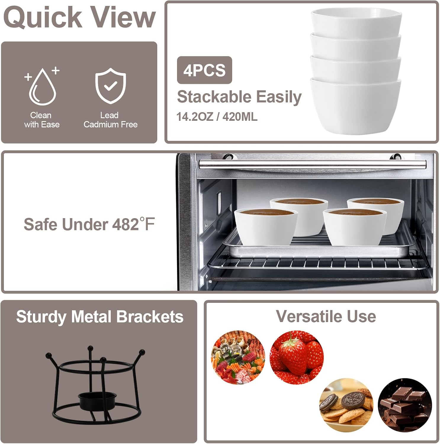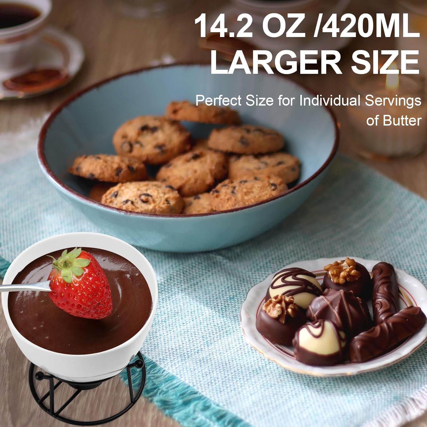 - OCCASIONS & VERSATILE RAMEKIN:The 420ml butter warmers large capacity allows for more butter to be served. In addition to butter heating,it can also be used to melt chocolate, heat sauces,dips,hot sauces,seasoning ect. These ramekins are perfect for presenting individual portions,including souffle, creme brulee,lava cakes,french onion soup, snacks, quiche,or ice cream ect ,like soup, ramen,stew,desserts,appetizers and puddings. Easily heat butter or chocolate with the butter warmer, adding a sense of ceremony to dipping.
