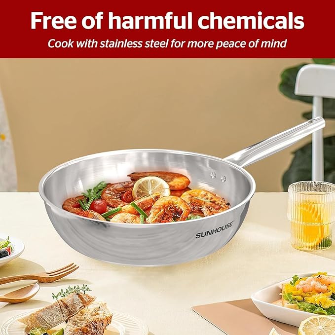 - Premium 18/10 Stainless Steel – Crafted from high-quality 18/10 stainless steel, Sunhouse Frying Pan is built to resist rust, corrosion, and staining, delivering long-term durability and a sleek, modern look for your kitchen.
