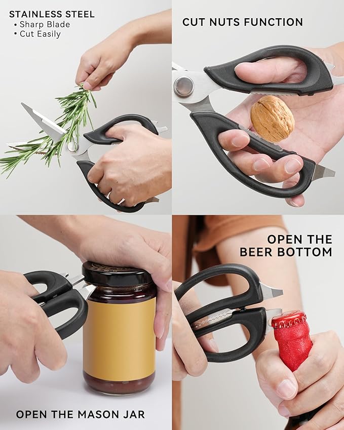 - KITCHEN ESSENTIALS - The all purpose scissors can be used to cut meat, chicken, fish and vegetables, and also be used for opening cans, opening bottle caps and crushing walnuts