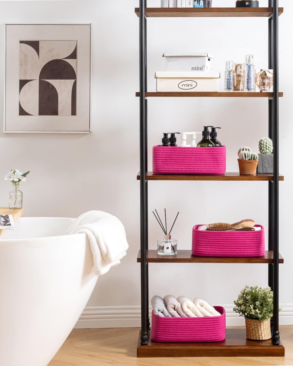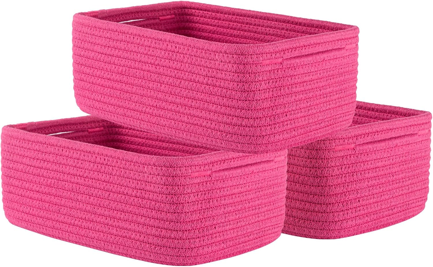 Small Woven Basket, 12 x 8 x 4.5 Inches, Storage Basket for Organizing, Cute Small Rope Shelf Closet Cube Storage Bins Baskets for Shelves, Dog Toy Gift Baskets Empty, 3 Packs, Hot Pink