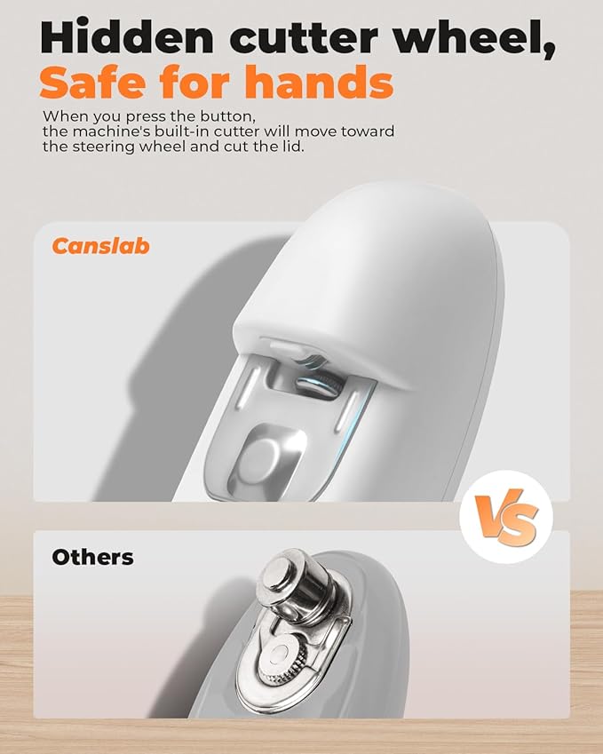 - 【Suitable for Most of Cans 】 Canslab Can Opener Electric is a portable must-have kitchen gadgets. It fits practically any sizes can (not for rimless soda cans) , and gives you the best hands-free experience when preparing food. Perfect or seniors with arthritis, people with hand injuries or limited grip strength, one-handed and left handed folks, or anyone searching for a more quicker way to open cans.