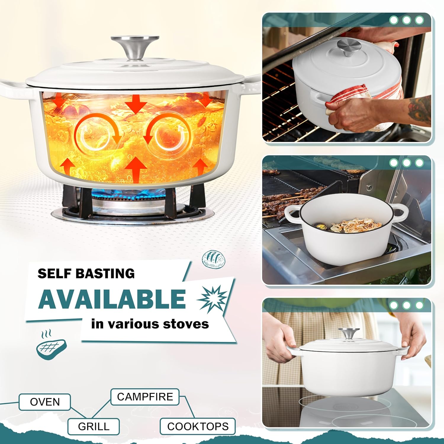 - ONE POT FOR MULTIUSE - Tight-fitting lid with bumps ensure a perfect sealing, Enabling water vapor to drip back into the pot, lock in nutrients and preserve flavor, Even heat conduction, retention and distribution for slow-cooking, such as baking sourdough breads, simmering casseroles, heating milk, poaching, marinating, roasting, stewing, searing