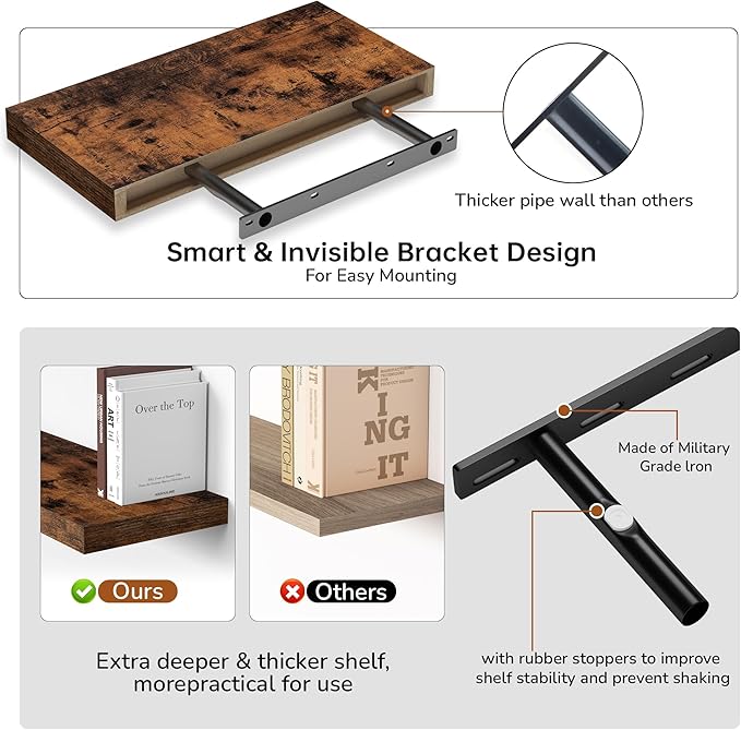 - Rustic & Modern Wooden Floating Shelves: Crafted from durable engineered wood with a realistic wood grain finish, our floating shelves offer the perfect blend of rustic charm and modern minimalism. The matte surface enhances its sleek, contemporary look, making it ideal for any room in your home. Whether you want to display your collection or organize essentials, these wall shelves seamlessly integrate with any décor and can be mounted on any wall to elevate your living space.