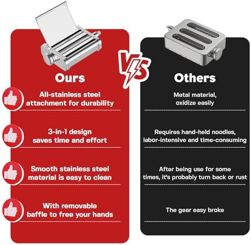 - The pasta maker for kitchenaid attachment is made of high quality 304 stainless steel for durability and longevity. It makes pasta efficiently and quietly and comes with a removable flap to free your hands and keep you safe!. The high-quality construction of this pasta attachment for kitchenaid ensures that you can enjoy making a variety of homemade pasta without having to worry about problems with the unit.