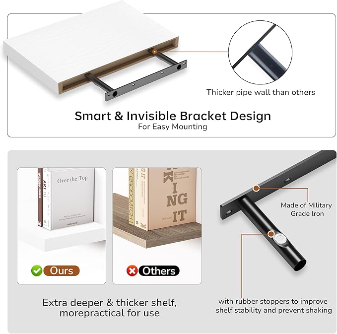 - Easy to Assemble & Install: Each shelf comes with everything you need for quick and easy assembly: durable steel invisible brackets, toggle bolts for drywall, and a straightforward instruction manual. With just one or two boards and a few screws, you can have the shelf up in no time. The included step-by-step instructions make the installation process hassle-free, and our customer support team is always available if you need assistance.