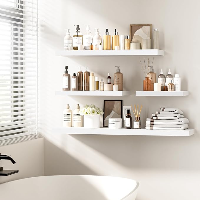 - Versatile & Multi-Scene Functionality: Our floating shelves are available in a variety of sizes and thicknesses, allowing you to choose the perfect fit for your space. Use them in the bathroom to store beauty products, hair care items. In the bedroom, they can hold books, cosmetics, and personal items. In the kitchen, they’re perfect for spices, jars, or small utensils. Or display photo frames, trophies, or collections in the living room. These shelves efficiently use wall space to create a tidier, more spacious feel in any room.