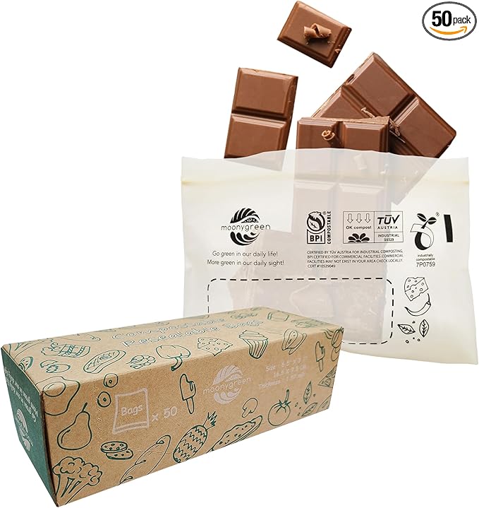 Compostable Food Storage Bags, Resealable Snack Bags, 50 Count, 6.5 x 3.7 inches, Extra Thick, Certified US BPI ASTM D6400 Europe OK Compost