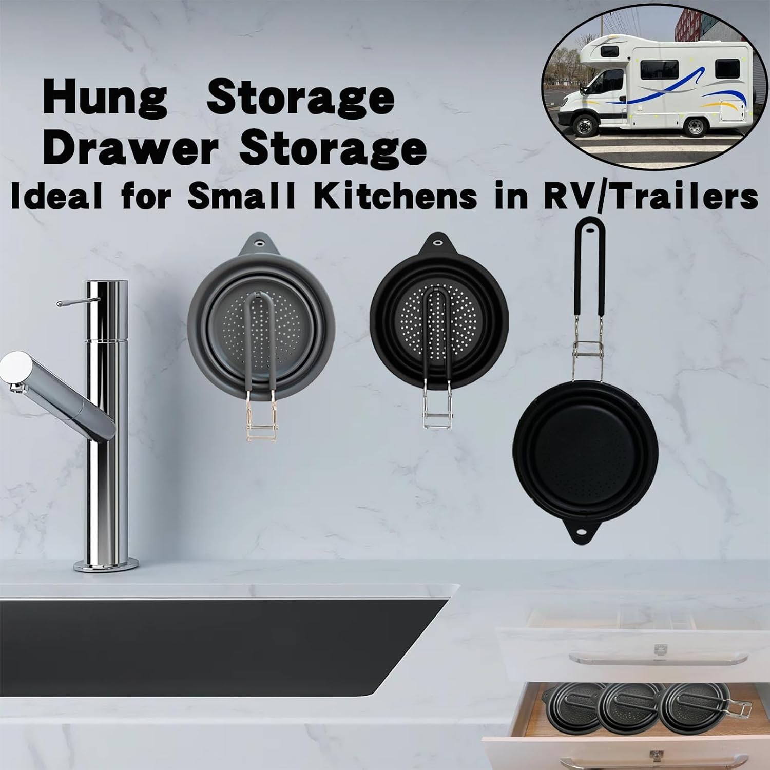 - COLLAPSIBLE COLANDER:Colander strainer and handle is collapsible,it can be placed in drawers,cabinets or hung up to save more space in the kitchen