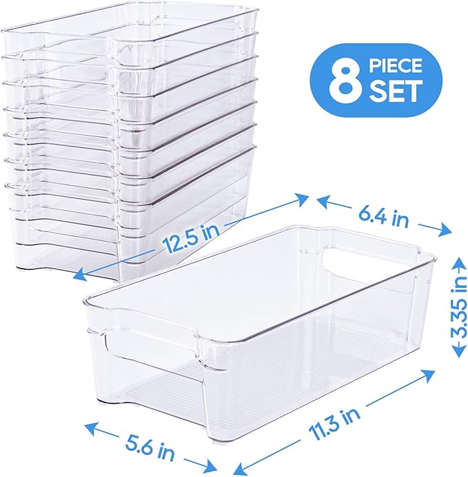 - 8-Pack Fridge Organizer Bins: Each bin measures 12.5''L x 6.4''W x 3.35''H. This set of 8 clear plastic bins is great for keeping your refrigerator neat and organized, helping you maximize storage space and create a more efficient kitchen
