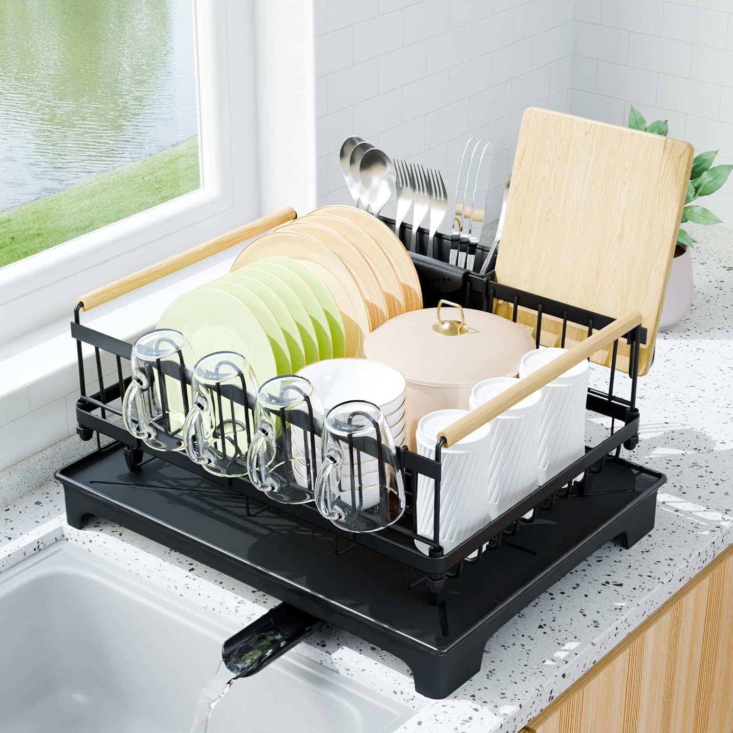 - Practical & Detachable Design: Black Dish racks for kitchen counter provide separate compartments for plates, bowls and cutlery, keeping everything neatly organized and easy to access; the detachable utensil holder, cup holders and cutting board holder can be easily stored when not in use.