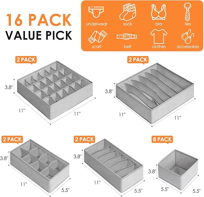 - 【COMPARTMENTS FOR MULTI STORAGE USE】Compared to others, our 8 pack drawer organizer set has 5 sizes for various storage needs. No matter it's knee sock, men boxer brief, or women leggings, they will all perfectly fit into our clothes organizer. Great for bedroom organization and dorm room storage.