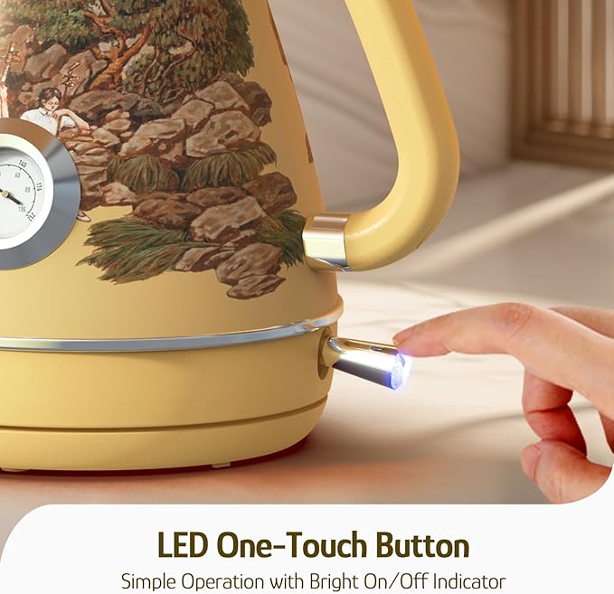 Hazel Quinn Retro Electric Kettle - 1.7 Liters / 57.5 Ounces Tea Kettle with Thermometer, All Stainless Steel, 1200 Watts Fast Boiling, BPA-free, Cordless, Automatic Shut Off - Garden Scenery