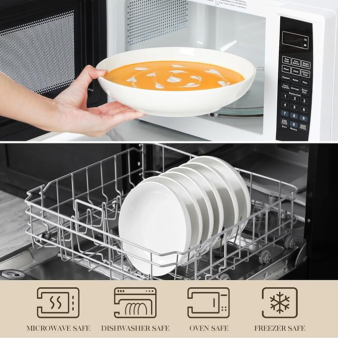 - 【WIDE & SHALLOW DESIGN】White Pasta Bowls featuring a wide and shallow design prevents spills and messes. Featuring a modern and minimalist design with a classic white finish and smooth glaze, these bowls complement any table setting and enhance dining experience.