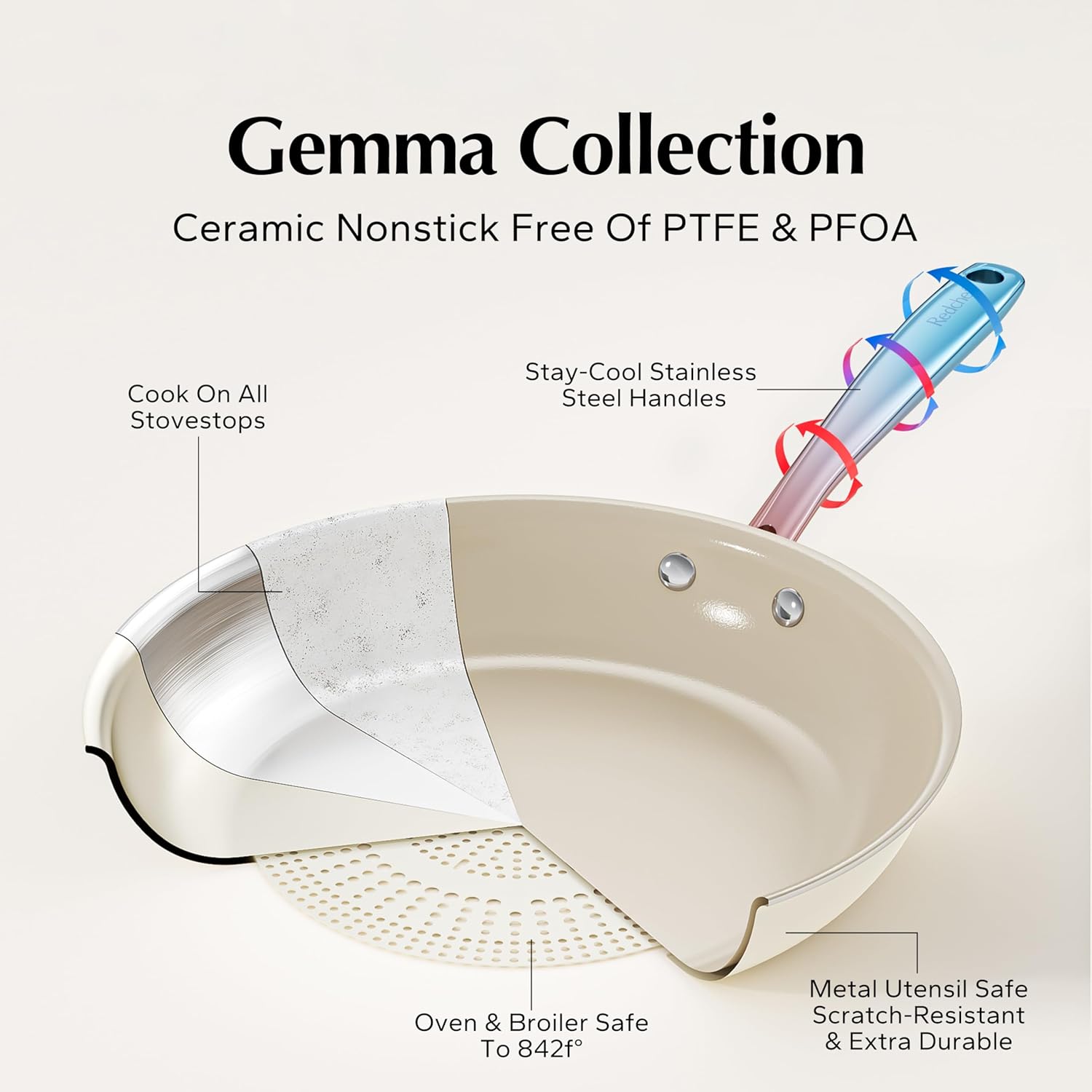 - Healthy Ceramic Coating: Redchef kitchen ceramic cookware set features a natural ceramic coating free from Teflon, PFAS, PTFE, PFOA, lead, and cadmium, ensuring safety and health. You can enjoy your cooking on cookware safely & easily