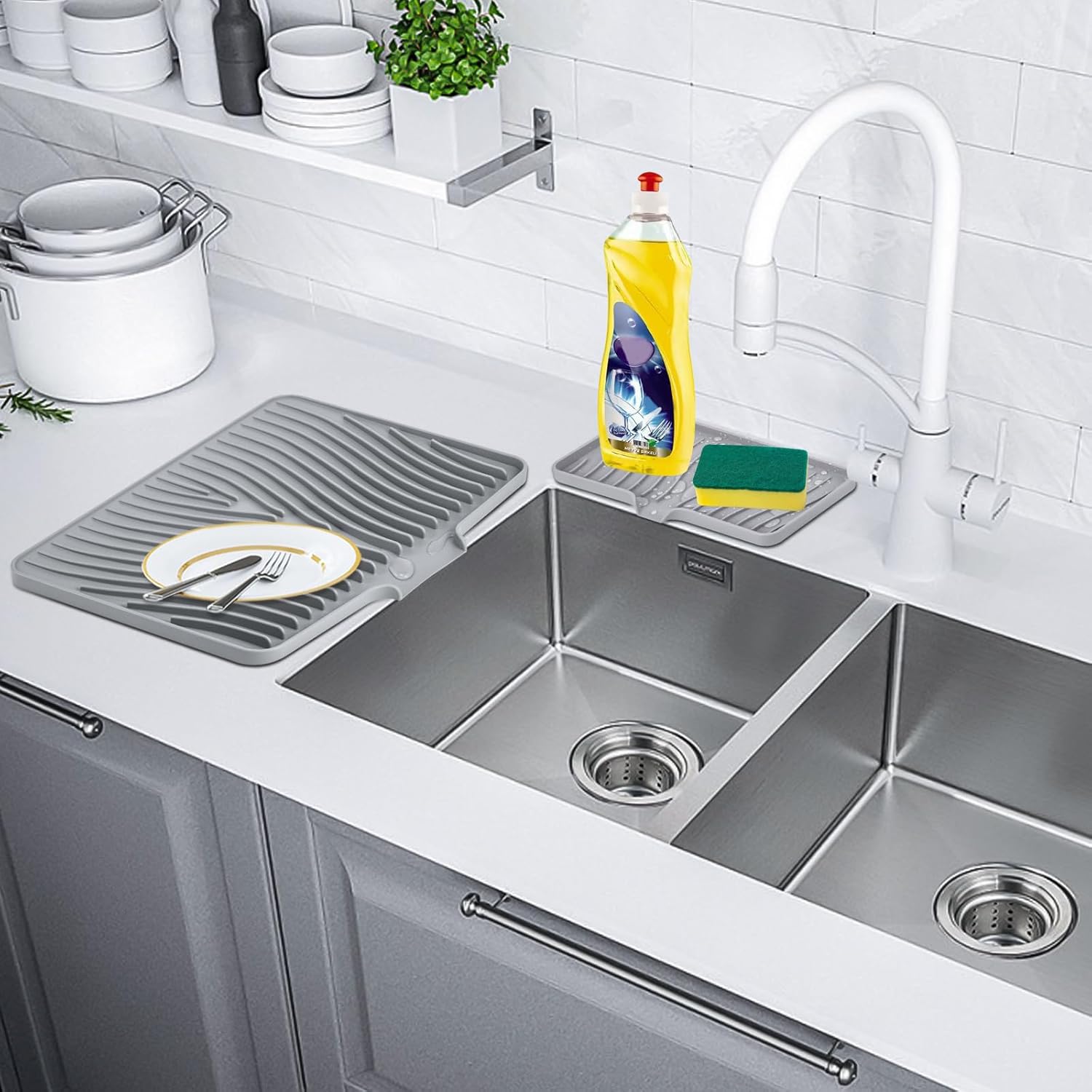 Silicone Dish Drying Mat for Kitchen Counter, Dish Drying Pad, Non-Slip Drain Pad with Built-in Drain, Heat Resistant Stone Drying Mat, 3 pcs (Grey)