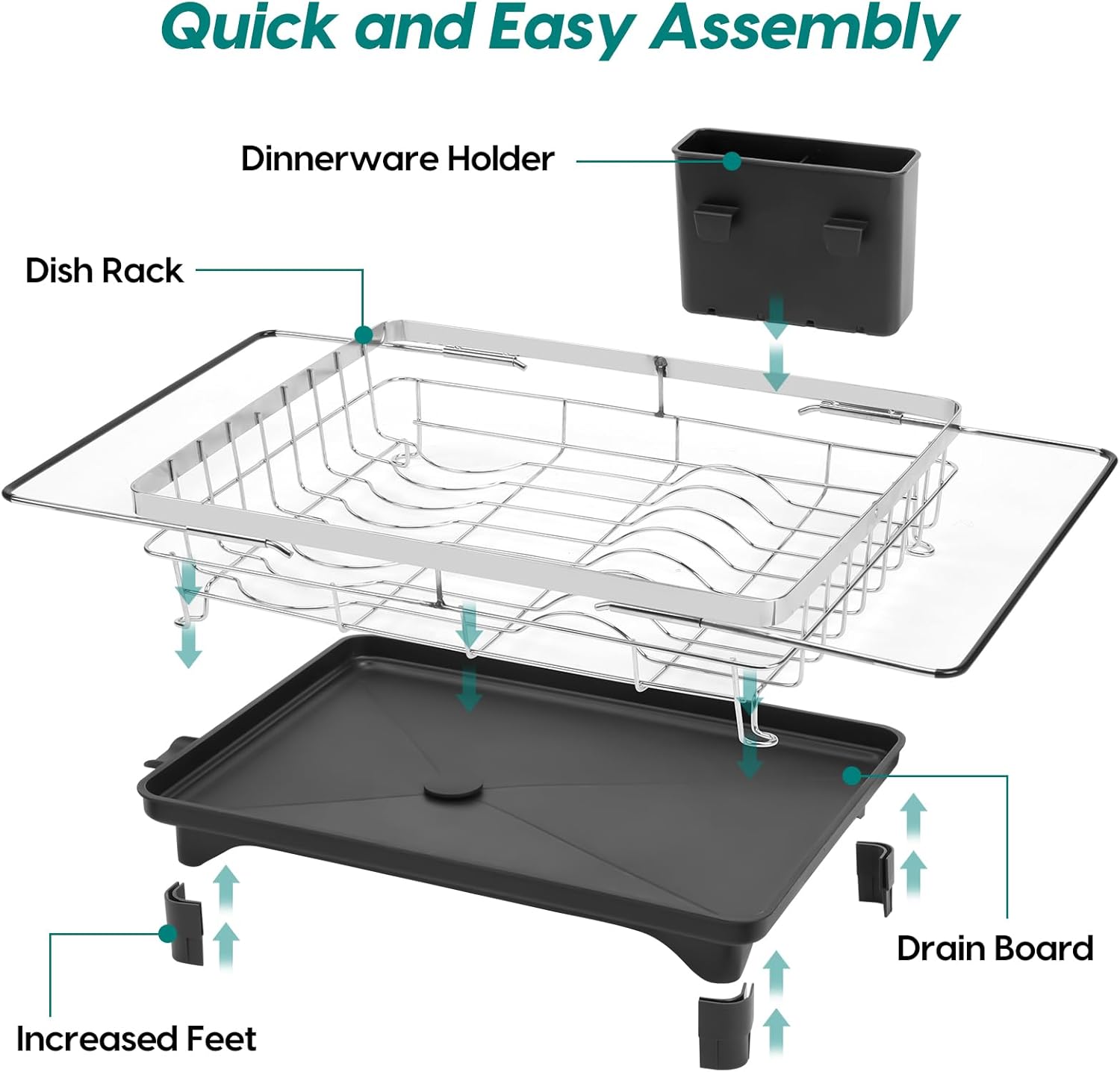 - π [RUST-PROOF & STRONG CONSTRUCTION] This high quality stainless steel sink drying rack with drain board is easy to maintain. It is corrosion-resistant, rust-resistant, load-bearing and warp-resistant. The non-slip rubber telescopic arms provide stability, preventing it from moving or falling into the sink during use and protecting the countertop and sink from scratches. Easy to clean, simply rinse under the faucet.