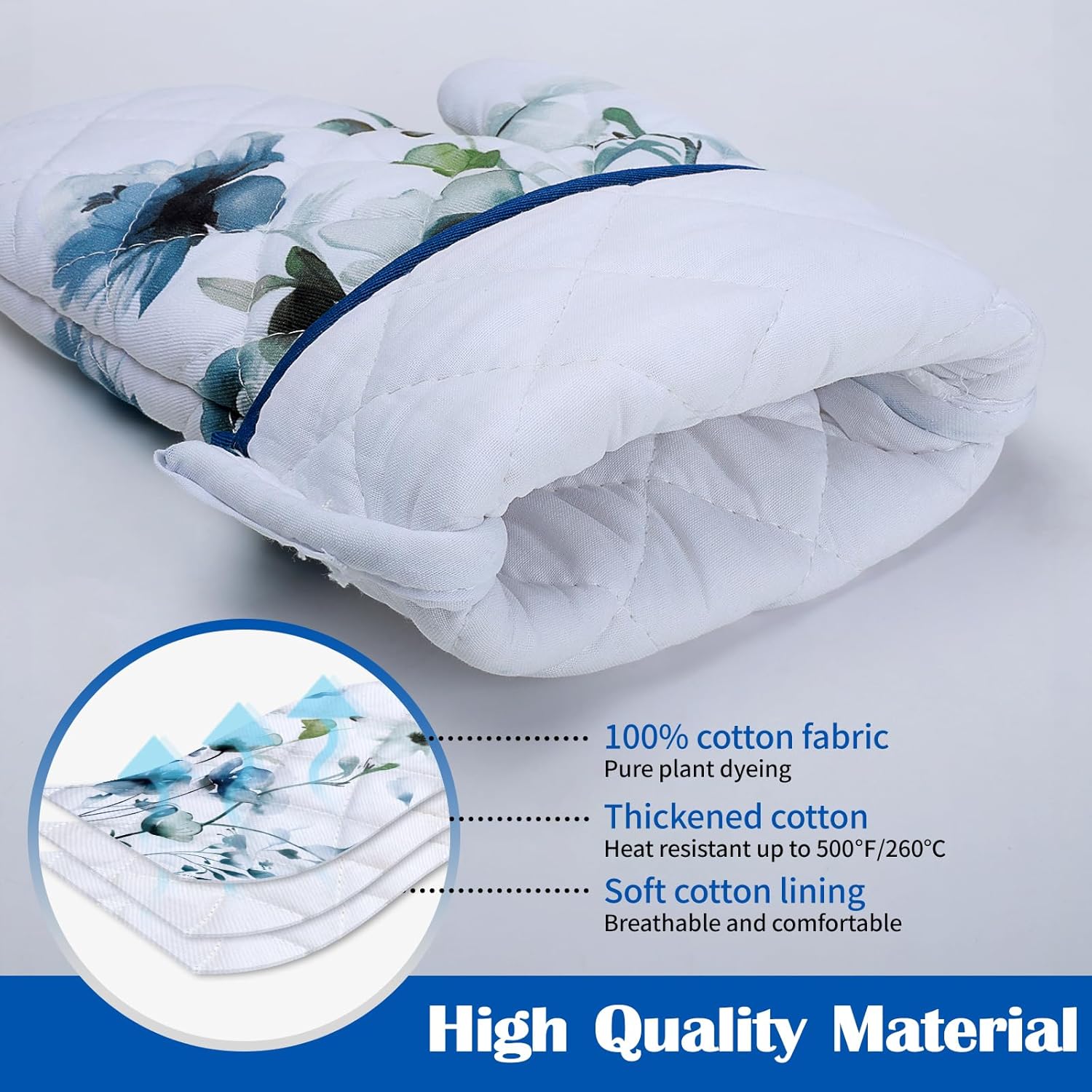 Blue Watercolor Flower Oven Mitts and Pot Holders Sets 4Pcs, 100% Cotton Heat Resistant, Extra Long Oven Gloves Potholder for Kitchen Cooking Baking Housewarming