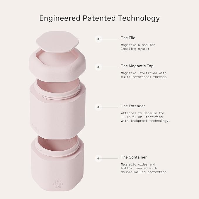 - OFFICIAL CADENCE DESIGN - Meet the Cadence Full Skincare Capsule Set, the ultimate travel essentials for women and men who want to keep skincare products neatly stored. These reusable capsules for travel toiletries comes with a labeled tile: cleanser, moisturizer, serum, toner, makeup remover, and sun icon.