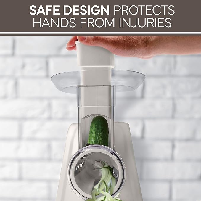 - Powerful 150W Motor for Efficient Performance: The high-powered motor ensures quick and precise grating and slicing, making it ideal for handling tougher ingredients like root vegetables and harder cheeses with minimal effort.