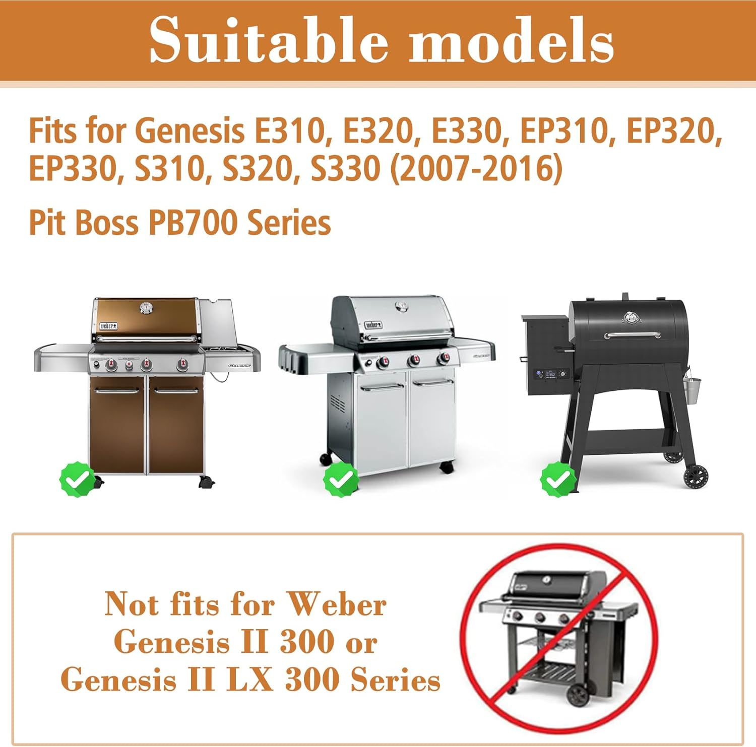 - Grill replacement parts for Weber Genesis E-310 E-330 E-320 E-300 S-310 S-320 S-330 EP-310 CEP-310 EP-320 CEP-320 EP-330 CEP-330. Grill parts designed specifically for the 2007-2016 Weber Genesis 300 Series grills. Grill replacement parts also fits for Pit Boss PB700 Series. Grill parts fits for weber genesis 300 series grill with Front-Mounted control panel.(2007-2016). Please Note: Grill replacement parts do not fits for Weber Genesis II 300 or Genesis II LX 300 Series.