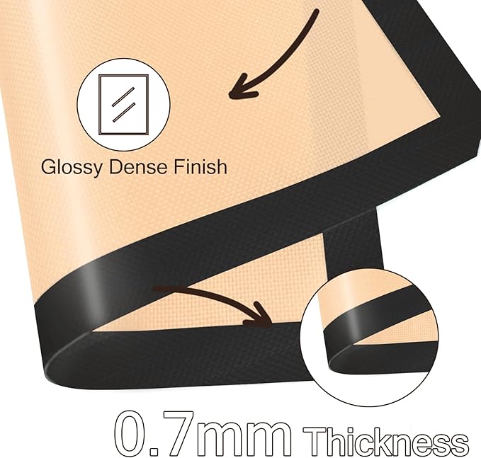 - [ NONSTICK SURFACE ] There is no need to grease the silicone baking sheet when using it, and even the dough is less likely to stick to the silicone baking sheets for oven. Each baking mat is 0.03 inches thick, double thickness for durability.