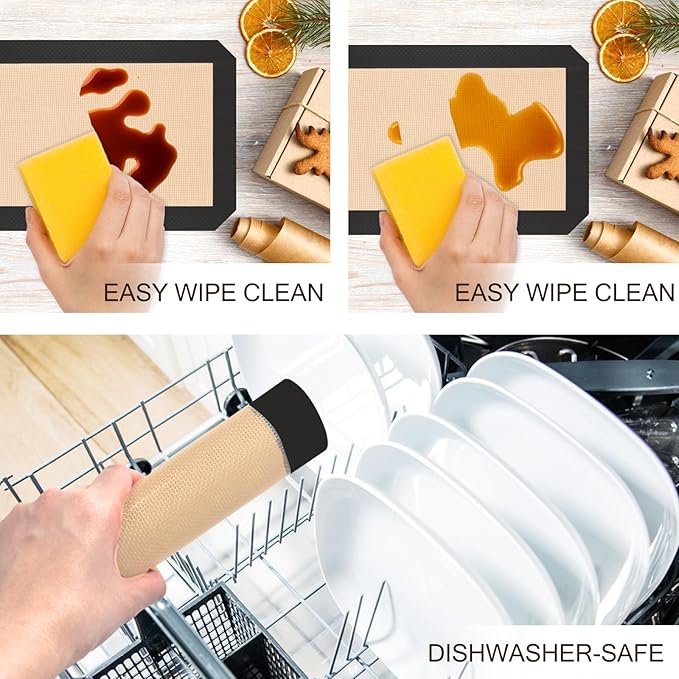 - [ EASY TO CLEAN ] You can simply wipe the surface of the silicone mat for baking with a damp soapy sponge and rinse it off. The baking mat is also dishwasher safe. Save time and effort by eliminating the need for parchment paper to clean silicone baking sheets!