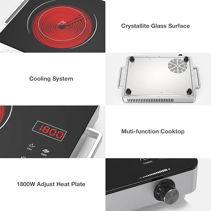 - Safety and Durability: The electric stove 1800w is built-in multiple safety protection measures, such as overheat protection, residual heat indication, auto shut-off and child safety lock, to ensure the safety of you and your family. The bottom is also equipped with a cooling fan, which effectively extends the service life. The crystalline surface can resist high temperatures and is more durable to use