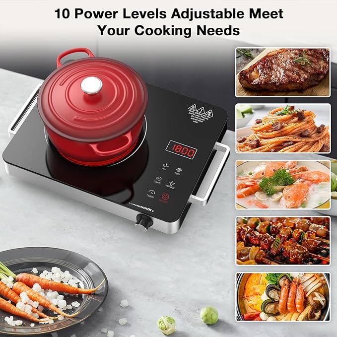 - Multi-function Ceramic Stove Electric Cooktop: Nafewin electric hot plate is made of ceramic heating panel, which has good thermal conductivity and can dissipate heat evenly, providing more balanced heat distribution and more even cooking. 10 power levels (100W-1800W) to meet your different choice which is convenient for you to choose the right power to cook a variety of different foods, perfect for braise, fry, simmer, steaming, boil, stir-frying, roast