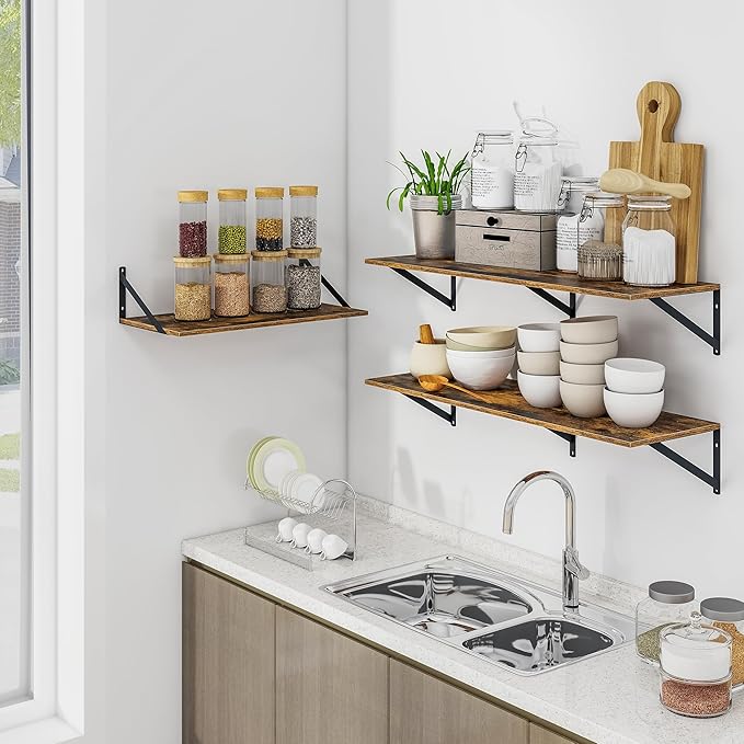 - [Large Capacity Floating Shelves] - Our wall shelves are 36" long x 12" deep, providing ample storage or display space for your kitchen, living room, bedroom, bathroom, laundry room, and more. With such a large space, you can place many items like books, collectibles, plants, crafts, photos, laundry detergent, etc. Our shelf can even be used as a bookshelf or a nightstand. Let our shelves decorate every corner of your home!