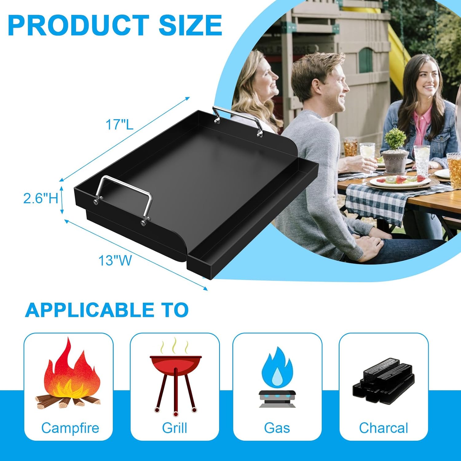 - Universal Flat Top Grill Plate: 17'' L x 13'' W x 2.6'' H, fits most charcoal grills, electric grills and gas grills. Fits for Weber, Nexgrill, Charbroil, Kenmore, Camp Chef, Brinkmann, Charmglow, Dyna-Glo, Master Forge, Members Mark, Expert Grill, Jenn Air, Backyard, Cuisinart,Traeger, Char-Griller, Masterbuilt Cabinet, Z GRILLS, etc. NOTE: Please check and compare with your grill size before ordering