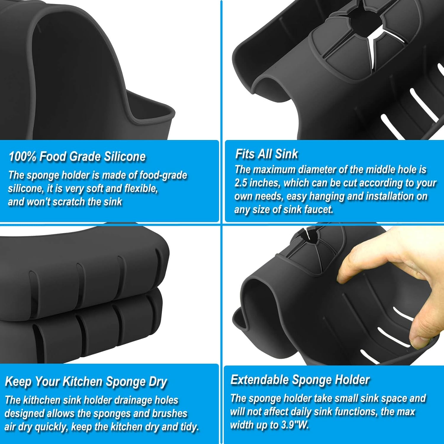 Sponge Holder for Kitchen Sink, Silicone Sink Saddle Caddy Organizer Rack, Sponges Holder Over Faucet, Hanging Kitchen Organizer Accessories Rack Basket Black