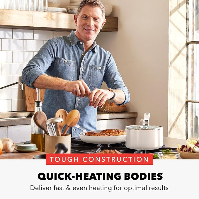 GreenPan x Bobby Flay 13 Piece Cookware Pots and Pans Set and 8" Chef's Knife. PFAS & PFOA-Free Ceramic Nonstick, Induction Suitable, Stay-Cool Silicone Handle, Dishwasher & Oven Safe, Cream
