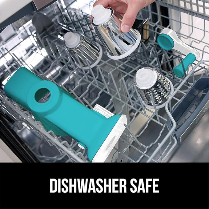 GORILLA GRIP BPA-Free Rotary Cheese Grater Hand Crank, Easy to Set Up, Strong Suction Base for Kitchen Countertop, Shred Potato, Vegetable, Nuts in Seconds, Round Mandoline Slicer, 3 Blades, Turquoise