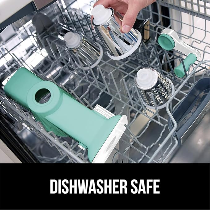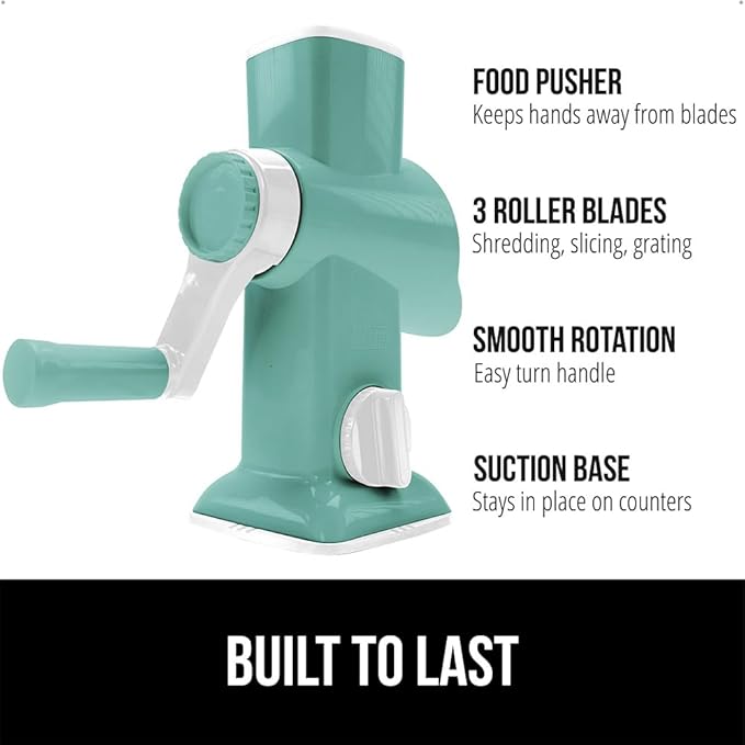 GORILLA GRIP BPA-Free Rotary Cheese Grater Hand Crank, Easy to Set Up, Strong Suction Base for Kitchen Countertop, Shred Potato, Vegetable, Nuts in Seconds, Round Mandoline Slicer, 3 Blades, Mint