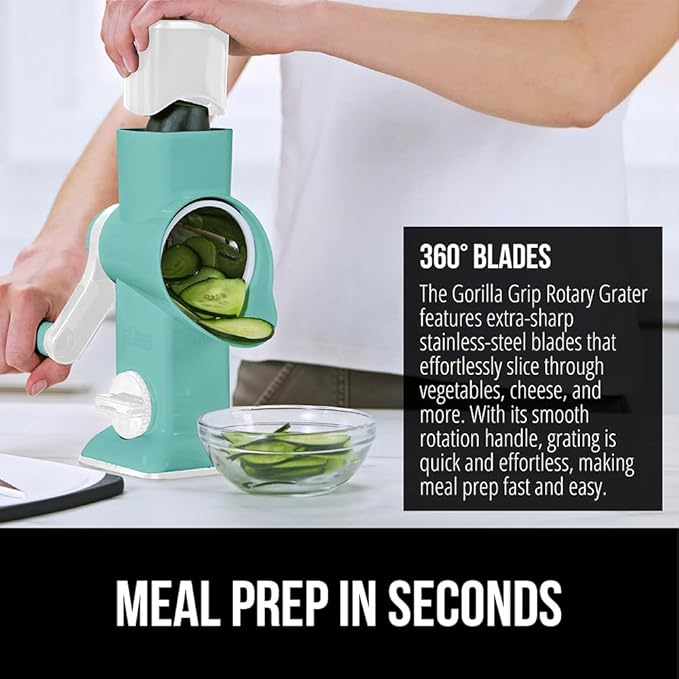 - POWERFULLY SLICE, GRATE, AND SHRED: the Gorilla Grip Rotary Cheese Grater helps save time on meal prep; food pusher keeps hands safe from blades; rotate the handle to slice and shred faster than by hand; spend less time in the kitchen, more time enjoying your meals