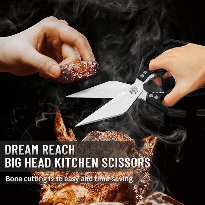 - Precision Cutting Made Easy: Dream Reach Big Head Series chicken scissors are crafted from premium 3Cr13Mov stainless steel, designed to effortlessly handle raw or cooked meat, poultry, seafood, and more. With their razor-sharp, heat-treated blades, cutting through ingredients has never been smoother or more efficient.