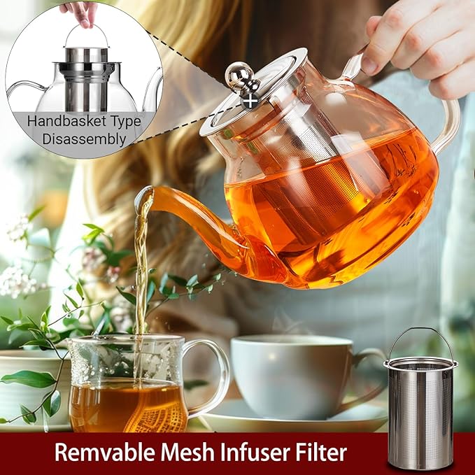 - [CLASSIC DESIGN WITH REMOVABLE INFUSER & LID]This teapot combines timeless style with practicality, featuring a removable 304 stainless steel infuser and durable lid that won’t rust, corrode, or discolor. Its handcrafted design allows you to gently steep loose-leaf tea or blooming tea, while the see-through glass showcases the tea leaves’unfurling beauty—perfect for a mindful tea experience..