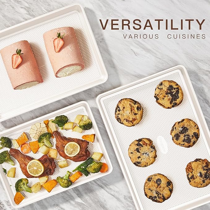 - INGENUITY DIAMOND TEXTURE - Featuring a unique diamond-textured surface, these baking trays for oven increase the contact area between food and hot air, improving heat circulation for more even baking. This design helps eliminate hot spots, ensuring consistent results every time. Capable of withstanding temperatures up to 500°F without warping, they offer outstanding durability.