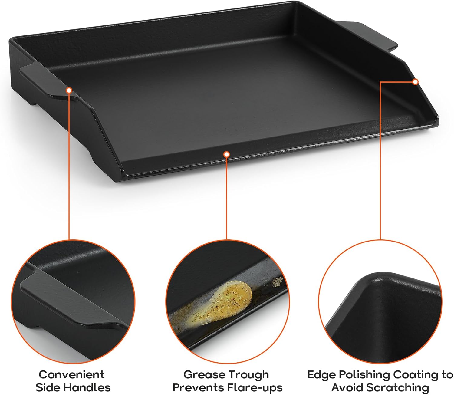 - The griddle is made from non-stick cast iron, strong and durable, and not easy to deformation. It's the perfect cooking tool for camping, tailgating, family party, and outdoor barbecues.