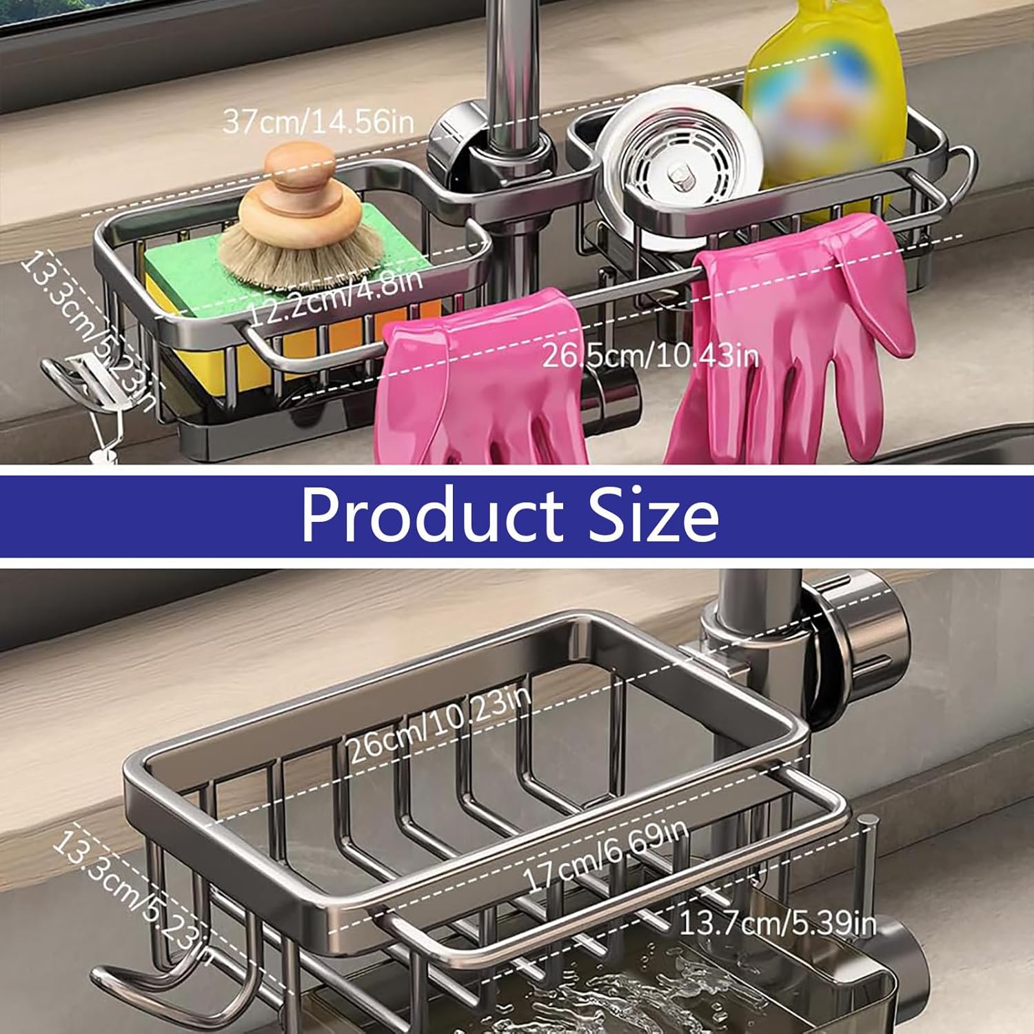 - 【Kitchen Sink Faucet Organizer】Our kitchen sink organizer can hold scouring pads, nylon scrubbers, brushes, soaps, sponges and other items. There is an extra hook to hang your towel, brush, or peeler to save your space. It organizes all your kitchen clutter and creates a clean and tidy kitchen environment for you.
