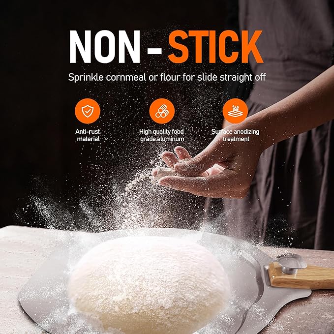- 【Durable and easy to use】: With a metal pizza peel thickened to 1.5mm, even your heaviest pizza won't bend. The anodized pizza paddles have a smoother and more corrosion-resistant surface, allowing the dough to slide more easily. The high-end oak handle provides a comfortable grip while also making it more durable and sturdy.