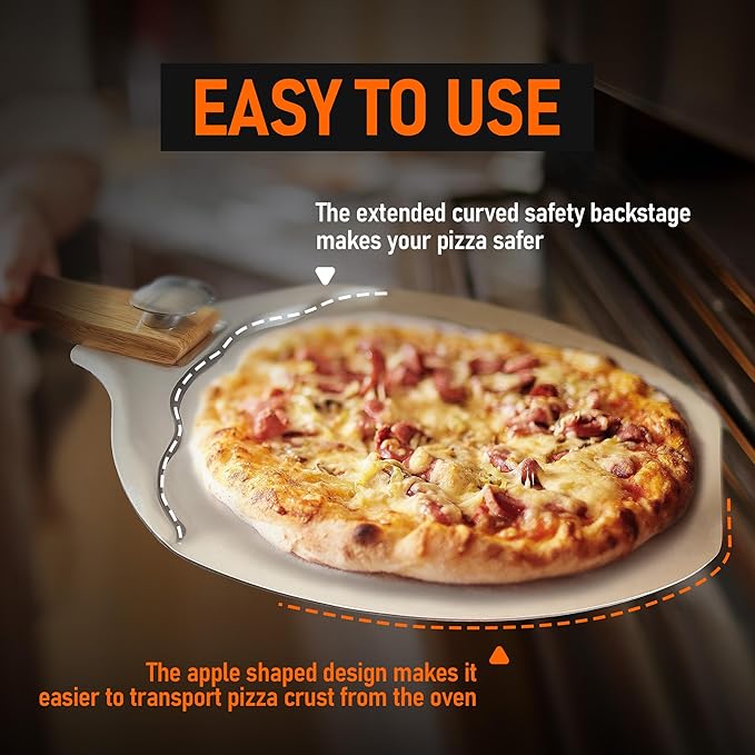 - 【Safe and reliable】: The newly designed apple shaped pizza peel not only looks beautiful but also makes it easier for your pizza paddle to enter and exit the oven, while avoiding bumps. The metal paddle have a Safety backstep, making your pizza safer when taken out of the oven.