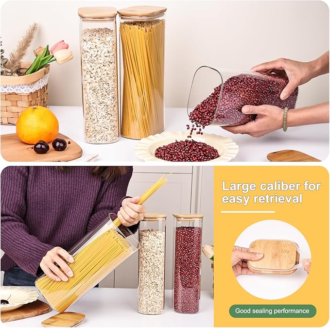 - Elegant and Practical Design: Elevate your kitchen organization with the sleek, square design of our Glass Food Storage Jars. These jars aren't just functional โ they're also a stylish addition to your countertop or pantry. The clear glass allows you to easily identify the contents, making meal prep and cooking a breeze.