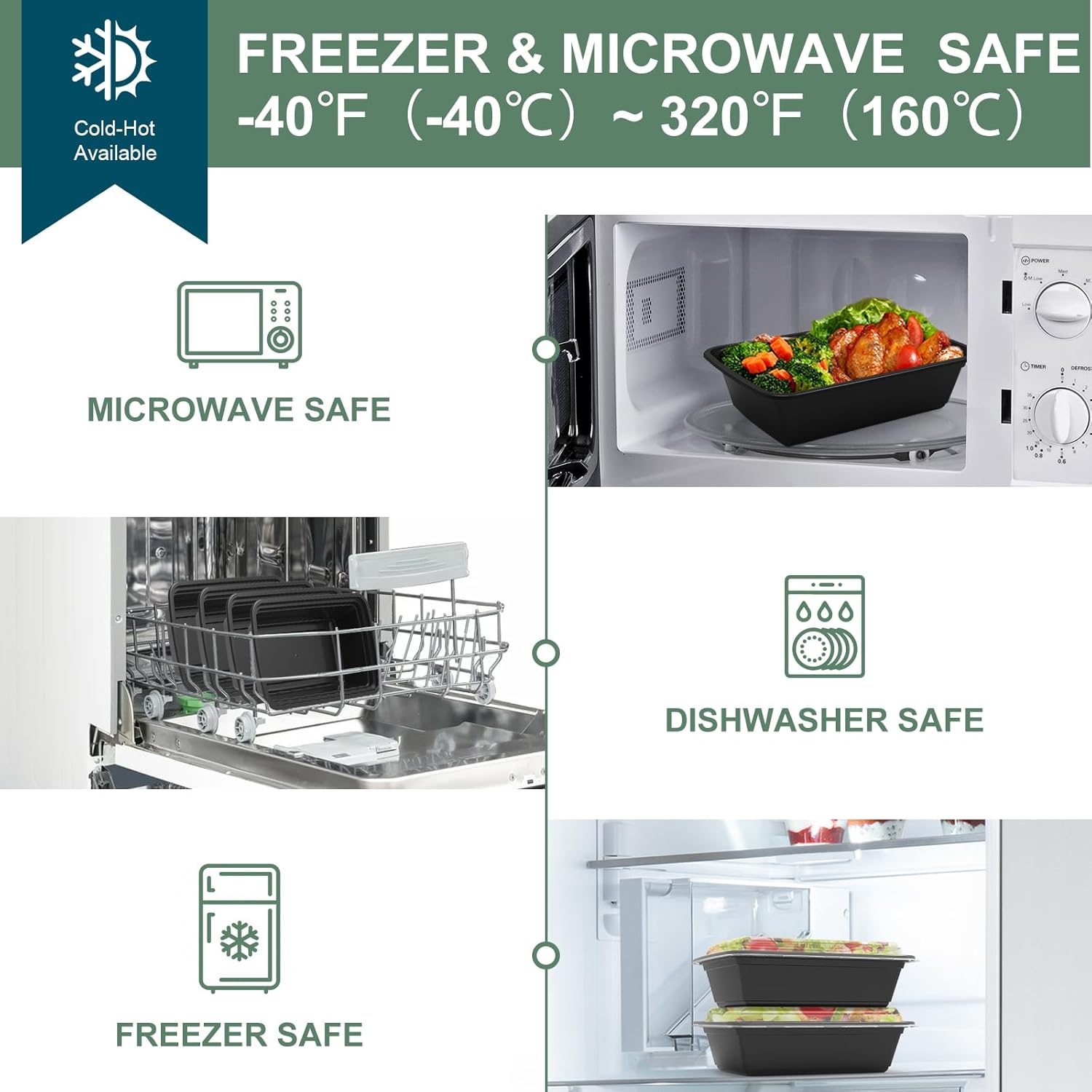 - DISHWASHER & FREEZER SAFE - Our food containers can be reheated or frozen and withstand temperatures in the range of (-40°F to 320°F) or ( -40°C to 160°C). Strong crack-resistant material is dishwasher safe and can be washed in the top rack of the dishwasher.
