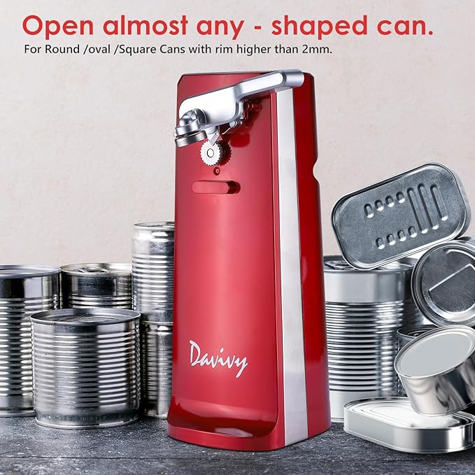 Davivy Electric Can Opener for One Touch Lid Opening,Removable Stainless Steel Cutter and 3- in-1 Design with Knife Sharpener and Bottle Opener, Red